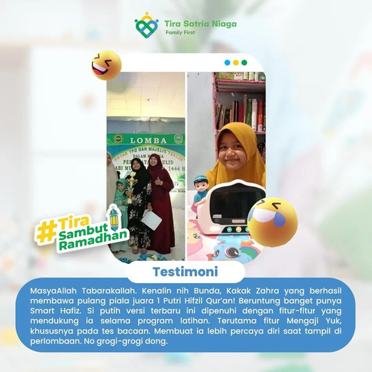 MasyaAllah Tabarakalla. Kenalin nih Bunda, Kakak Zahra yang berhasil membawa pulang piala juara 1 Putru HifZil Qur'an! Beruntung banget punya Smart hafiz. Si putih versi terbaru dipenuhi dengan fitur-fitur yang mendukung ia selama program latihan. Terutama fitur Mengaji Yuk, khususnya pada tes bacaan. Membuat ia lebih percaya diri saat tampil di perlombaan. No grogi-grogi dong.