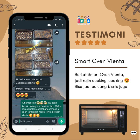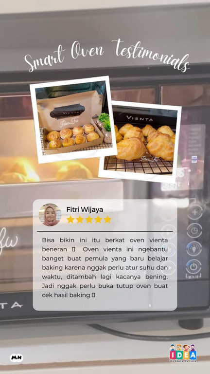 "Bisa bikin ini itu berkat oven vienta beneran oven vienta ini ngebantu banget buat pemula yang baru belajar baking karena ngga perlu atur suhu dan waktu, ditambah lagi kacanya bening. Jadi nggak pelu buka tutup oven buat cek hasil baking. - Fitri Wijaya
